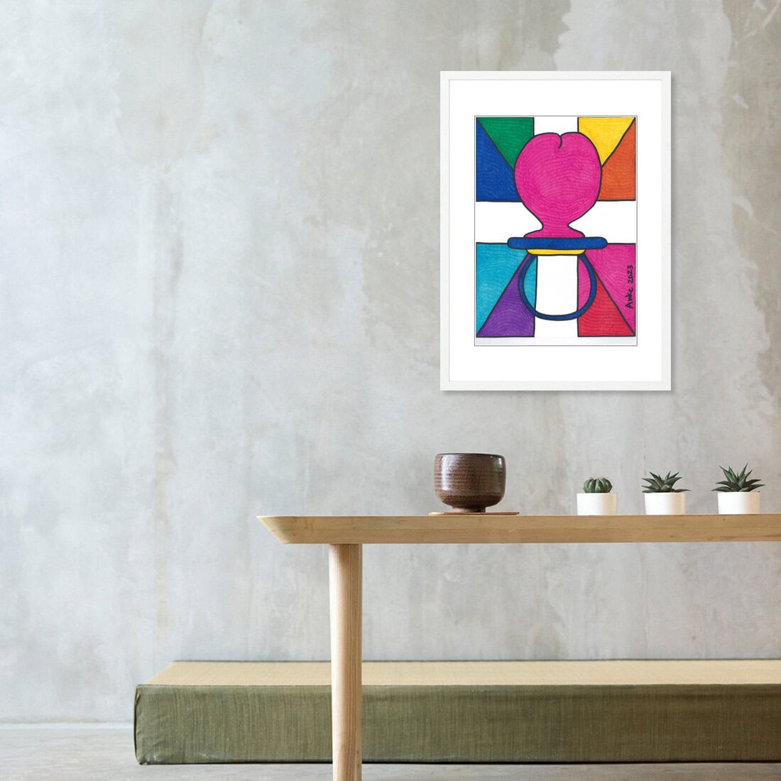 At first glance, this striking composition—dominated by a sculptural pink pacifier set against vibrant color blocks—offers a whimsical aesthetic. But linger a little longer, and you’ll feel the deeper, archetypal pull pulsing underneath the image. For not only does the central pink pacifier call to mind erotic play but also the taboo desires contained within many parent-child relationships. More than just a colorful image, An Oedipal Tête-à-Tête is an internal conversation starter as well as an invitation to embrace the complexity and ambiguity of the parent-child relationship with a wink and a smirk. Size: A3.Additional information