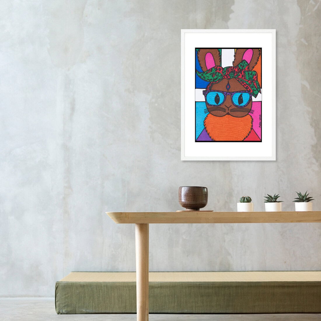 She’s got the ears, the attitude and the balls to wear her kinks out loud. Kinky Bunny is playful, proud, and unapologetically perverse—just like the souls she represents. With her big blue eyes and leopard-print bow, she stares you down, dares you to look away and then draws you in deeper. This triptych –inspired by porn– is about doubling down on your deviance. Kinky Bunny’s cute face flanks her central holes–bold, bright and stylized in a sea of colors reminiscent of catholic church stained glass windows. You know who you are. She knows it too. Size: A3.Additional information
