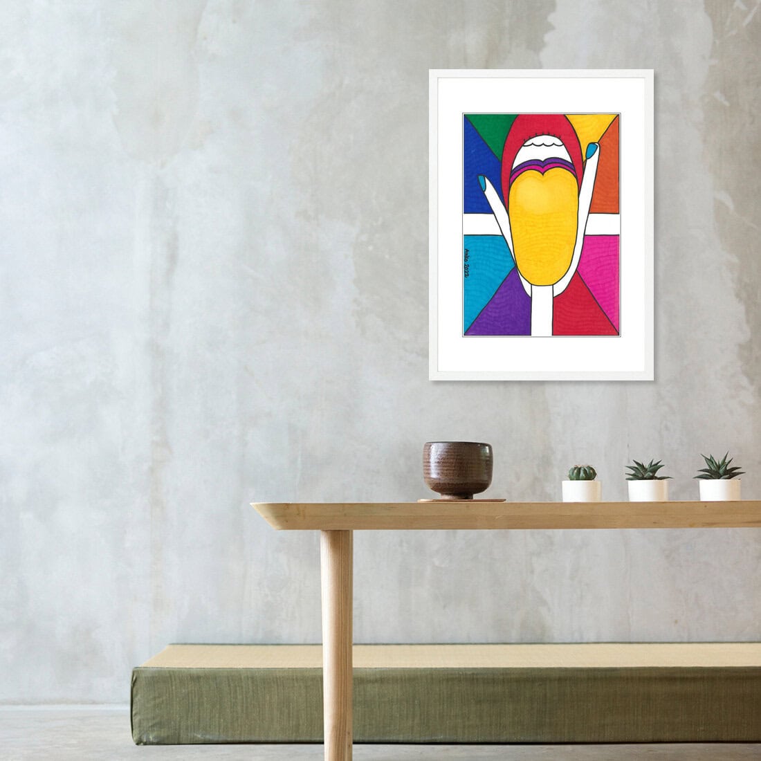 There’s no mistaking what’s happening here: a parting of fingers, an open mouth ready to receive and a tongue offering itself up to giving head. This explicit suggestion of upcoming satisfaction reads as cheeky, yes, but also as natural. Playing out against a colorful backdrop that echoes stained glass church windows, Oral is a visual reminder of our body’s innate ability to give and receive pleasure. Directly. Enthusiastically. Indiscriminately. Consider this art print as an invitation to explore your body’s capacity for pleasure–and maybe hang it on the wall for good measure ;-) Size: A3.Additional information